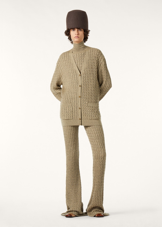 Illuminated with shimmering lurex yarns, the Bihar trousers are spun in sumptuous cashmere fused with lustrous silk. They are shaped with an elongated, flared line that reveals a delicate cable motif. To finish, an elasticated waistband adds a note of elevated comfort.